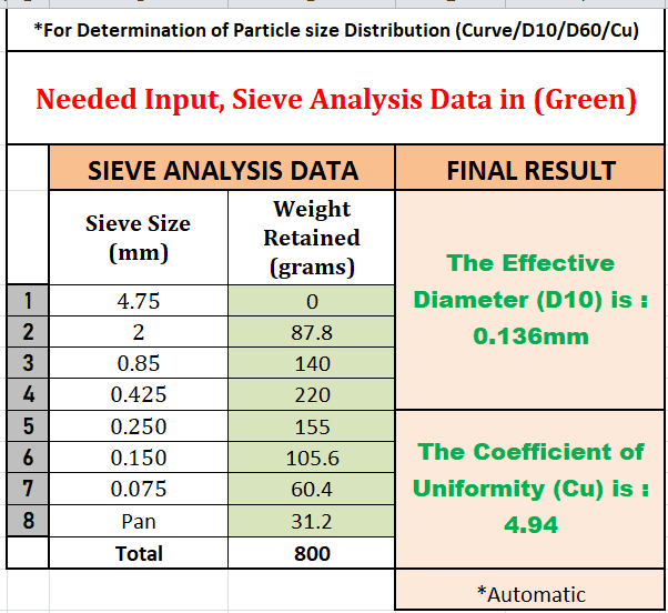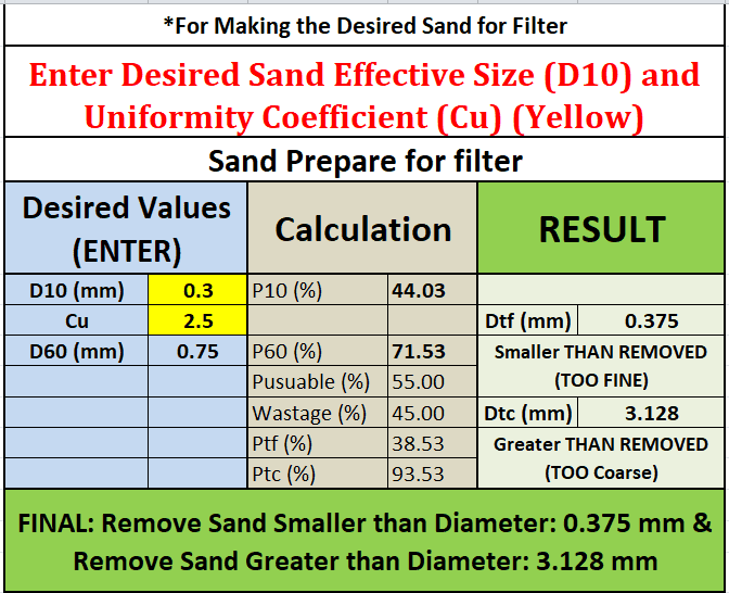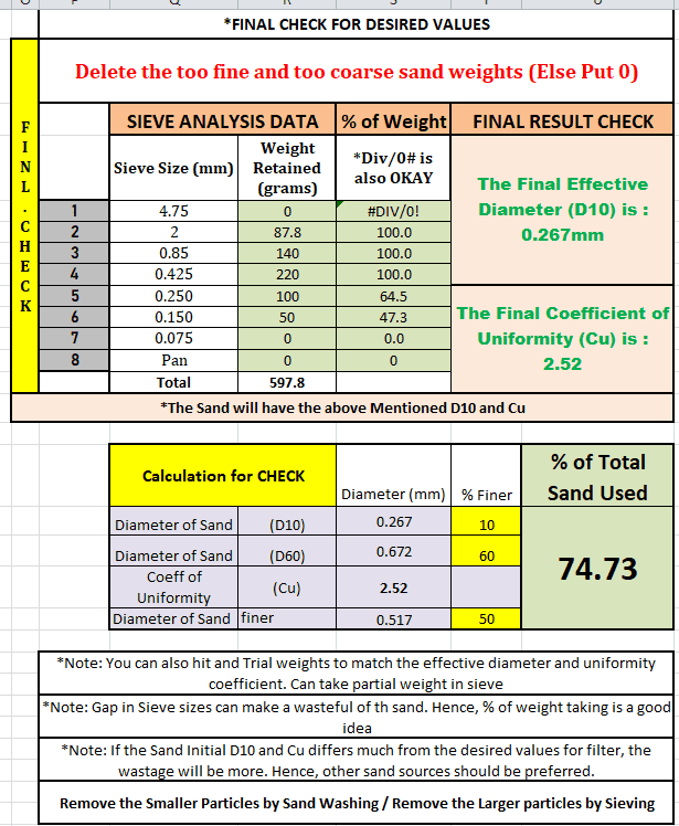 You’ll get the final effective diameter and coefficient of uniformity of the sand. The total percentage of initial sand used is also given.