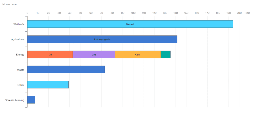 Around 60% of the global methane is produced due to human activities and the sources also include landfilling and wastewater treatments (Source).